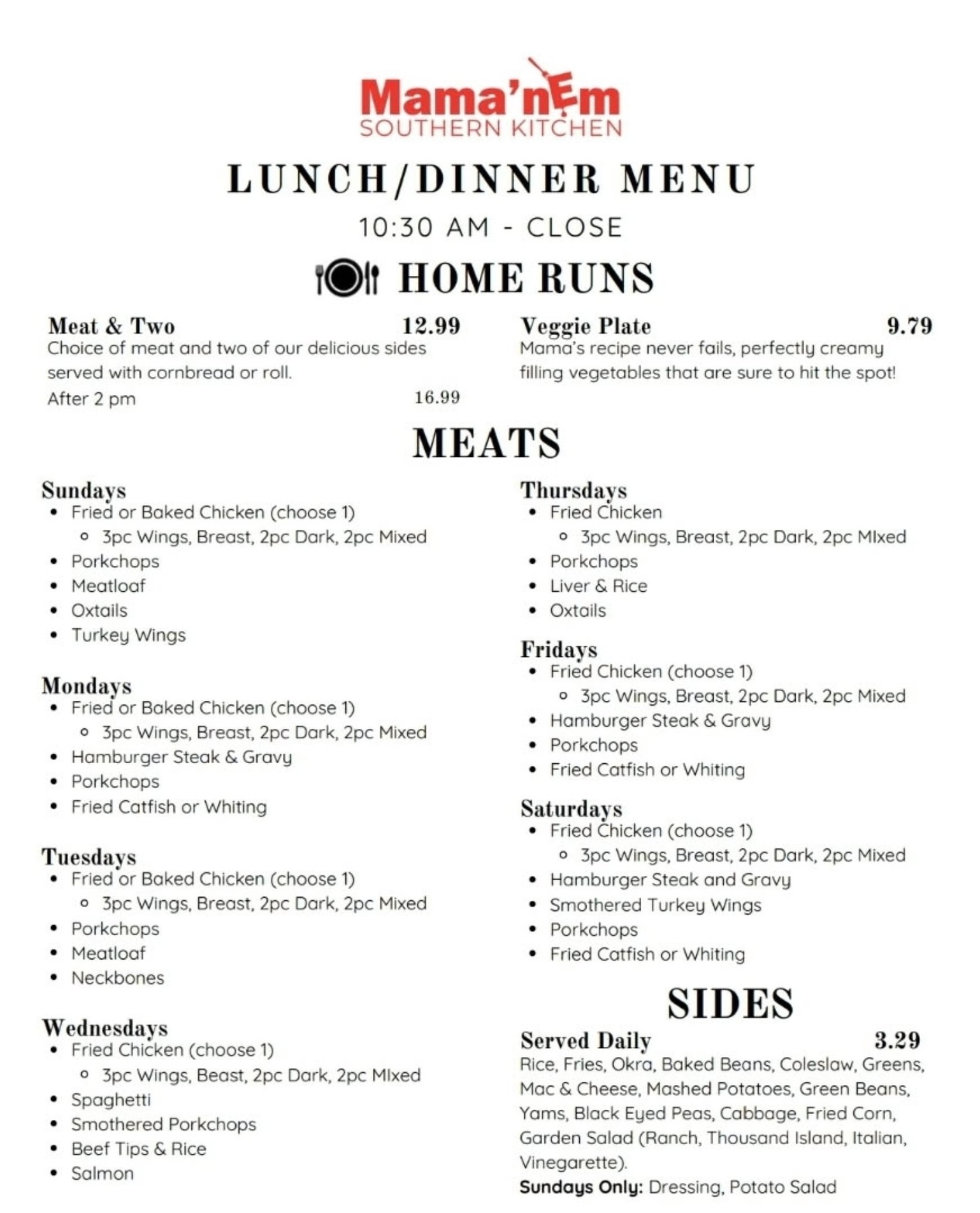 At Mama’ Nem Southern Kitchen, we do more than serve food—we serve memories. Our menu is full of Southern staples made with love and high-quality ingredients, from golden fried chicken and creamy mac and cheese to greens, gravy, and breakfast favorites that start your day right. Whether it’s a meat-and-two lunch special or a dinner plate that tastes just like Sunday at Mama’s, every bite is rooted in comfort, care, and community.